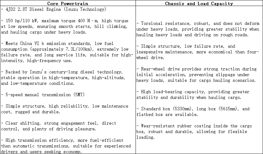Les principaux avantages de la camionnette manuelle 2RM 2026 RE-MAX 2.8T sont son moteur diesel Isuzu classique de grande cylindrée + sa transmission manuelle 5MT + sa propulsion arrière + son châssis robuste. Il met l'accent sur la durabilité, les performances puissantes sous de lourdes charges, l'efficacité énergétique et le retour sur investissement rapide, ce qui en fait le premier choix pour les utilisateurs ayant des besoins purement utilitaires et des budgets limités.